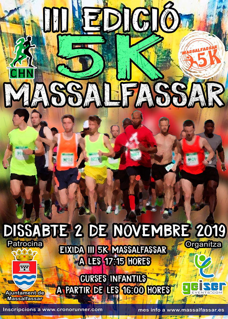 El Ayuntamiento de Massalfassar en Valencia organiza el sábado 2 de Noviembre la III carrera 5K de Massalfassar 2019, prueba puntuable para la III edición del circuito Caixa Popular de la comarca de L’Horta Nord en Valencia. La carrera dará comienzo a las 17:15h. desde la Av. Blasco Ibañez de la población. Previamente se celebrarán carreras infantiles a partir de las 16:00 horas.