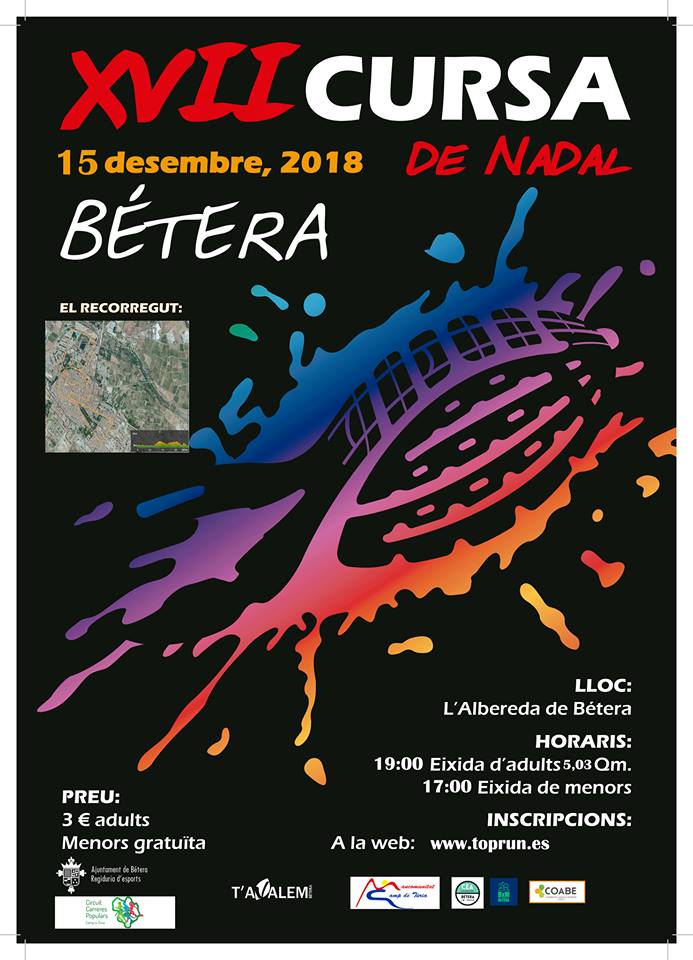 El ayuntamiento de Bétera en Valencia en colaboración con el CEA Bétera y BxM i COABE organizan la XVII Cursa de Nadal Bétera 2018, carrera que cerrará el Circuito de Carreras Populares de la Mancomunidad del Camp de Turia.