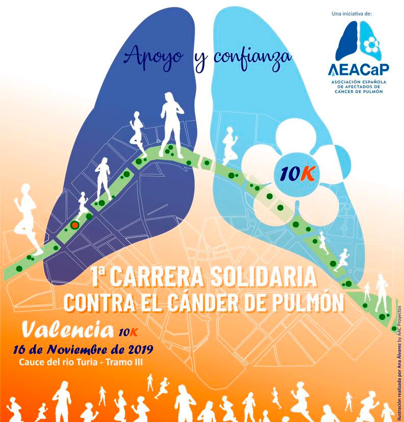 La Asociación Española de Afectados de Cáncer de Pulmón organiza el sábado 19 de Noviembre de 2019 la I Carrera Solidaria del Cáncer de Pulmón en Valencia. Será un recorrido de 10Km con salida y llegada en las pistas de atletismo del Tramo III del Jardín del Turia de Valencia. La salida será a las 9:30 horas.