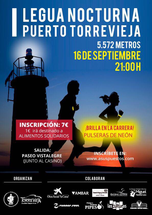El próximo sábado 16 de Septiembre de 2017 a las 21:00h., tendrá lugar la I Legua Nocturna Puerto de Torrevieja. El recorrido de 1 legua, 5572m tendrá salida y llegada en el paseo Vistalegre de Torrevieja (Alicante), junto al casino.