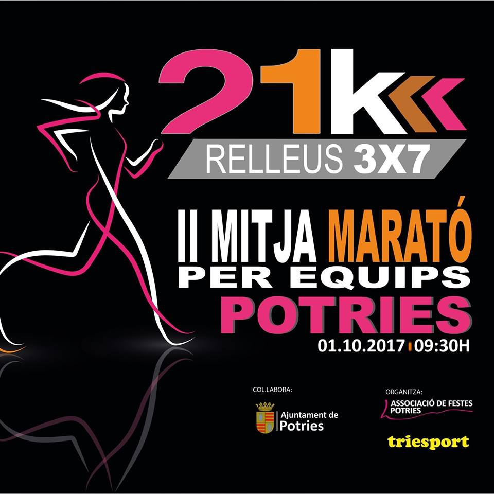 La Asociación de fiestas de Potries en colaboración con el Ayuntamiento organizan la II Media Maratón por equipos Potries 2017 que tendrá lugar el 1 de Octubre a partir de las 9:30 horas.