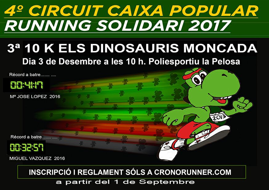 La carrera 10K Dinosauris Moncada se celebra el 3 de Diciembre de 2017 a las 10:00 horas. Una prueba organizada por el G.E. Els Dinosauris. Tendrá como punto de partida la pista de atletismo del polideportivo de la “PELOSA”.