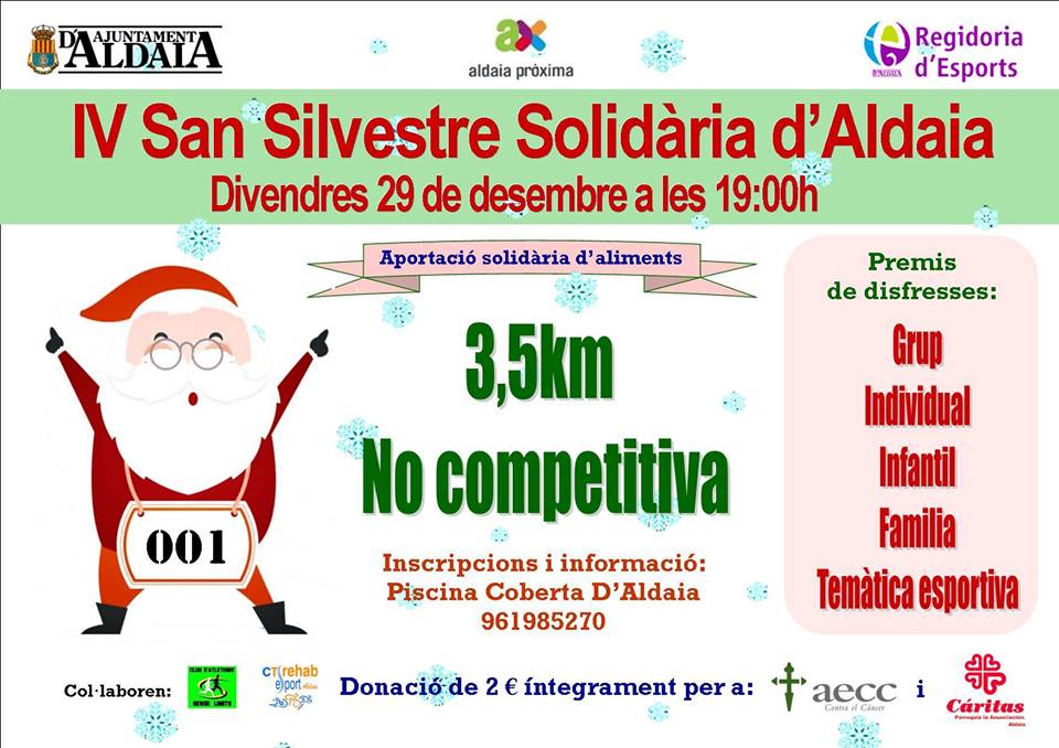 En esta edición la recaudación irá en beneficio de Cáritas Aldaia La Anunciación y AECC de Aldaia. Las inscripciones están disponibles hasta el 26 de Diciembre en las instalaciones de la Piscina cubierta de Aldaia (de lunes a viernes de 7:00 a 22:00 y fines de semana de 9:00 a 14:00h.)