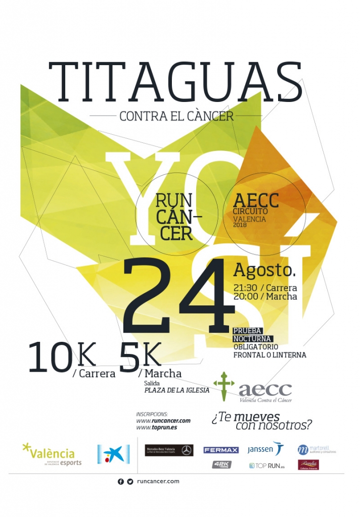 El circuito solidario RunCáncer Valencia 2018 llega el 25 de Agosto a la población de Titaguas para la celebración de una jornada deportiva y solidaria consistente en una marcha de 5Km y una carrera nocturna de 10km.