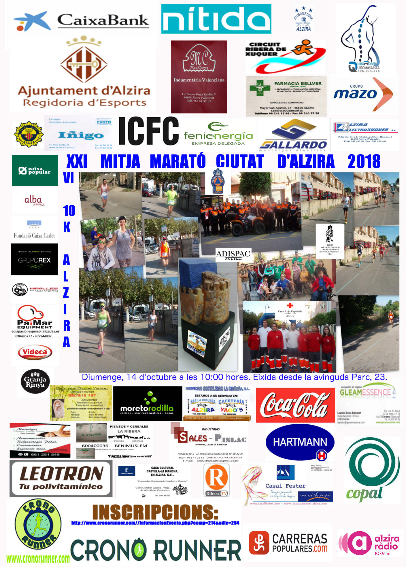 El Club Atletisme Alzira organiza la XXI Media Maratón Ciudad de Alzira 2018 y la VI carrera 10K ciudad de Alzira que se celebra el domingo 14 de Octubre.