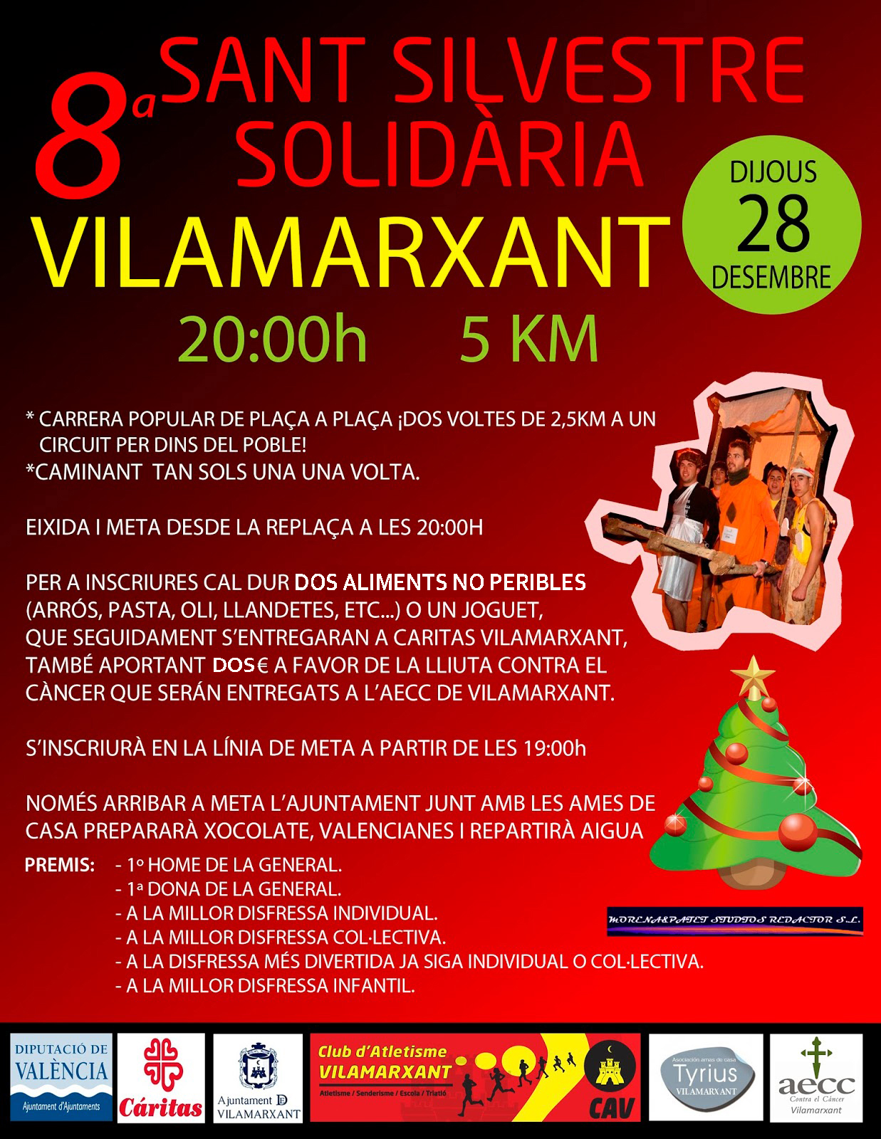 El Ayuntamiento de Vilamarxant en colaboración con el Club de atletismo Vilamarxant, las Amas de casa Tyrius, Caritas Vilamarxant y la Asociación Española contra el Cáncer de Vilamarxant organiza la octava edición de la carrera San Silvestre Solidaria Vilamarxant 2017.