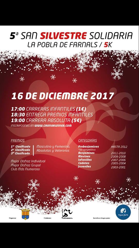 El Club Esportiu Pobla y el excelentísimo Ayuntamiento de La Pobla de Farnals organizan la V San Silvestre Solidaría Pobla de Farnals 2017.