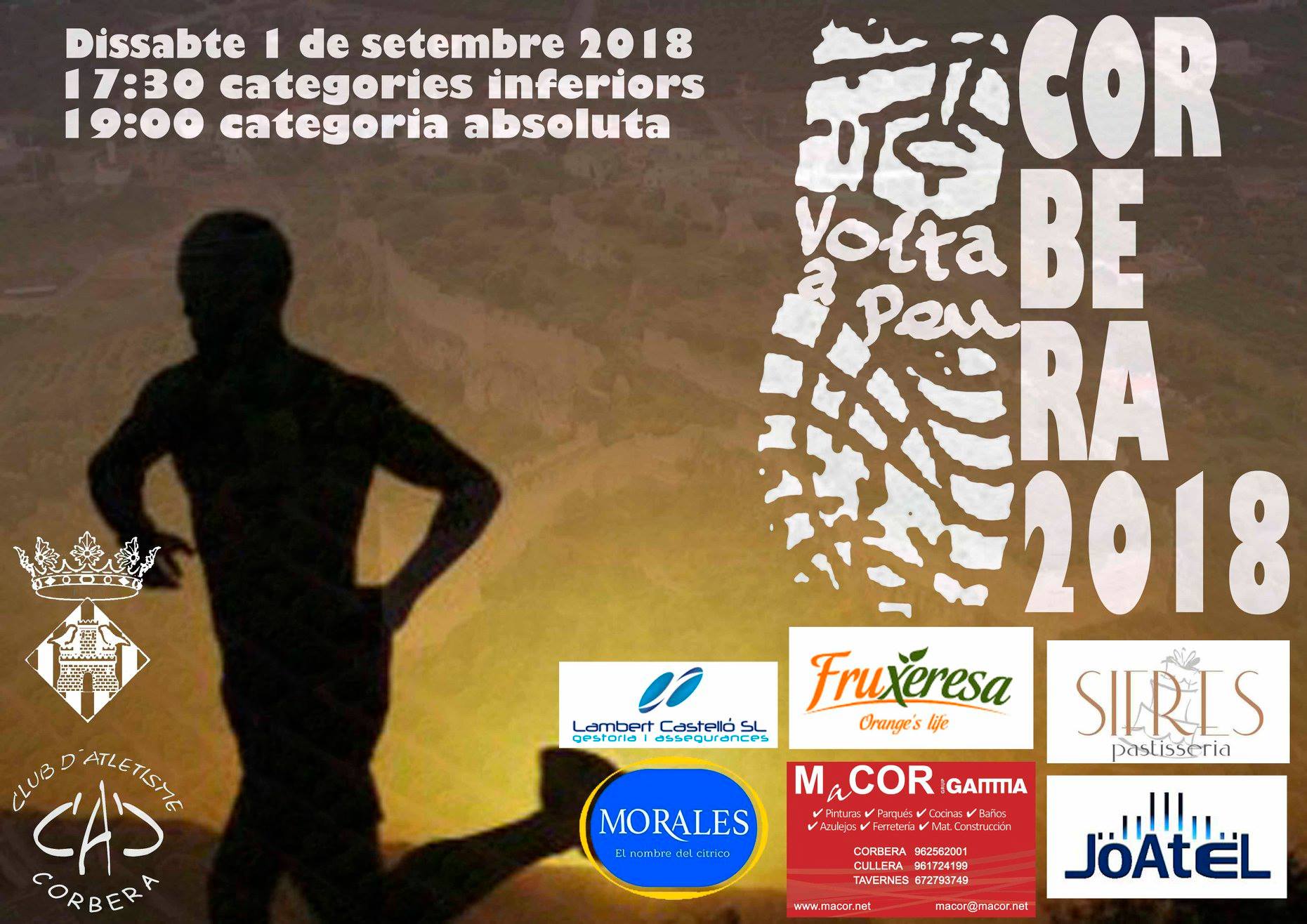 El Club de Atletismo Corbera organiza la XXI Volta a Peu Corbera 2018 que se celebra el sábado 1 de Septiembre. El recorrido consta de 8000 metros y transcurrirán totalmente por asfalto. La recorrido comenzará con una vuelta de 900 metros por dentro del pueblo pasando por línea de meta. A continuación se darán 2 vueltas, una de 3100 metros y otra de 4000 por dentro y fuera del pueblo.