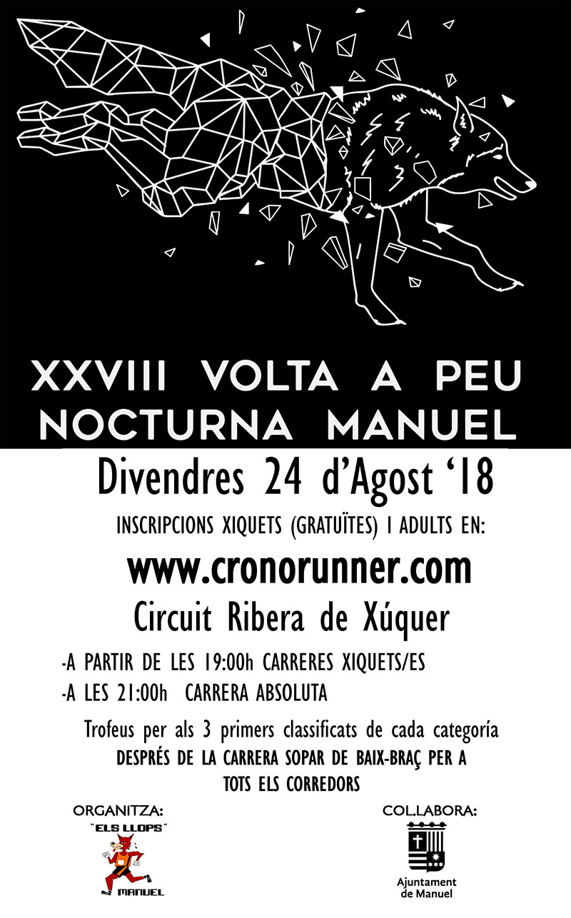 La asociación deportiva «Els Llops de Manuel» junto al ayuntamiento de Manuel en la provincia de Valencia organizan la 28ª edición de la Volta a Peu Nocturna Manuel 2018 que se celebra el Viernes 24 de Agosto.