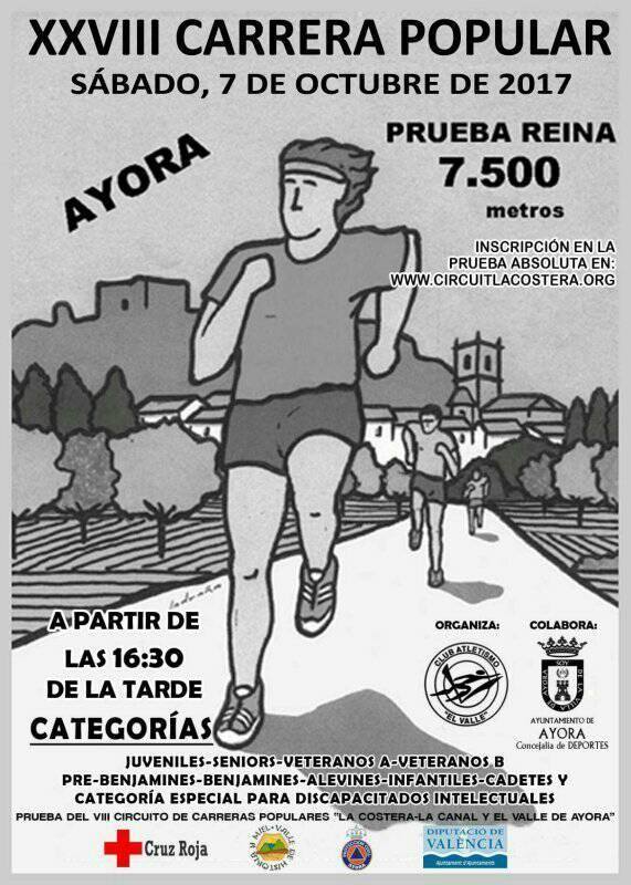 La XXVIII Carrera Pedestre Villa de Ayora se celebra el Sábado 7 de Octubre de 2017 a partir de las 16:30 horas. Un recorrido de 7500 metros con salida y llegada a meta en la Plaza Valle de Ayora.