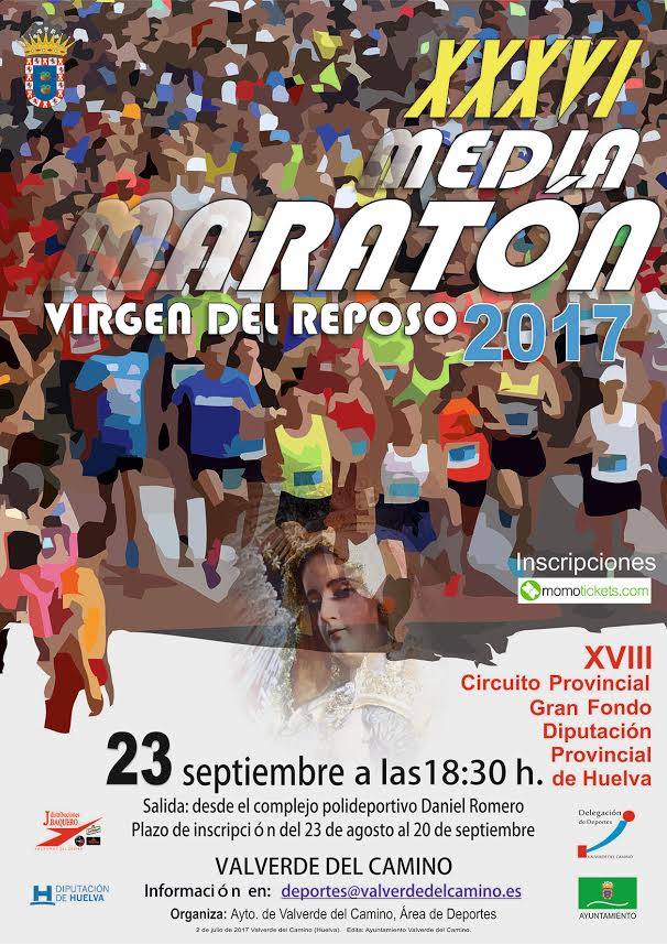 El sábado 23 de septiembre de 2017, a las 18.30 horas se celebra la XXXVI Media Maratón Virgen del Reposo 2017, con salida y llegada en las Pistas de Atletismo del Complejo Deportivo Municipal de Valverde del Camino.